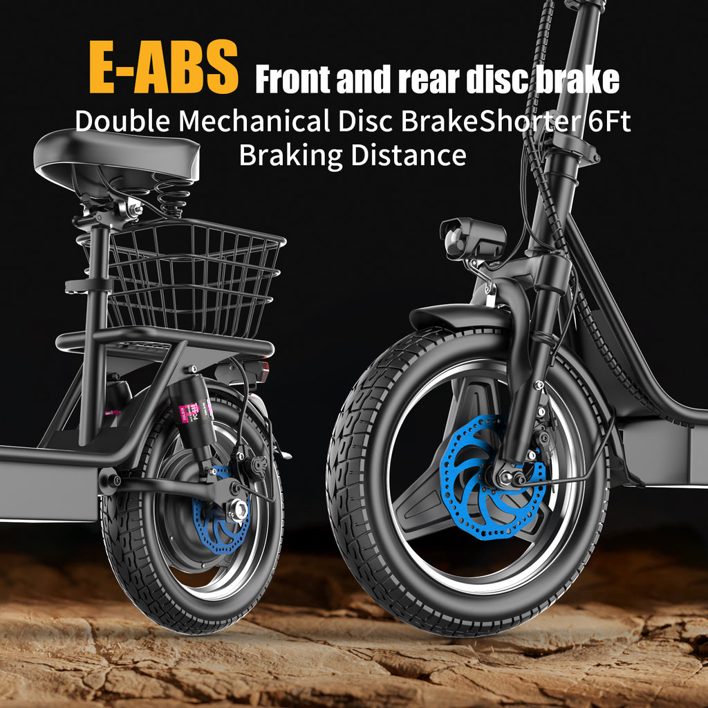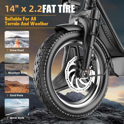 【Comfortable Ride】- Enjoy the riding pleasure of the electric scooter for adults, equipped with a soft and breathable seat, you will not feel tired during long-distance riding. Thick, sturdy 14" tires and front and rear dual shock absorbers absorb most of the impact, providing a comfortable ride. The 9.5" wide deck provides plenty of room for your feet and even small pets.