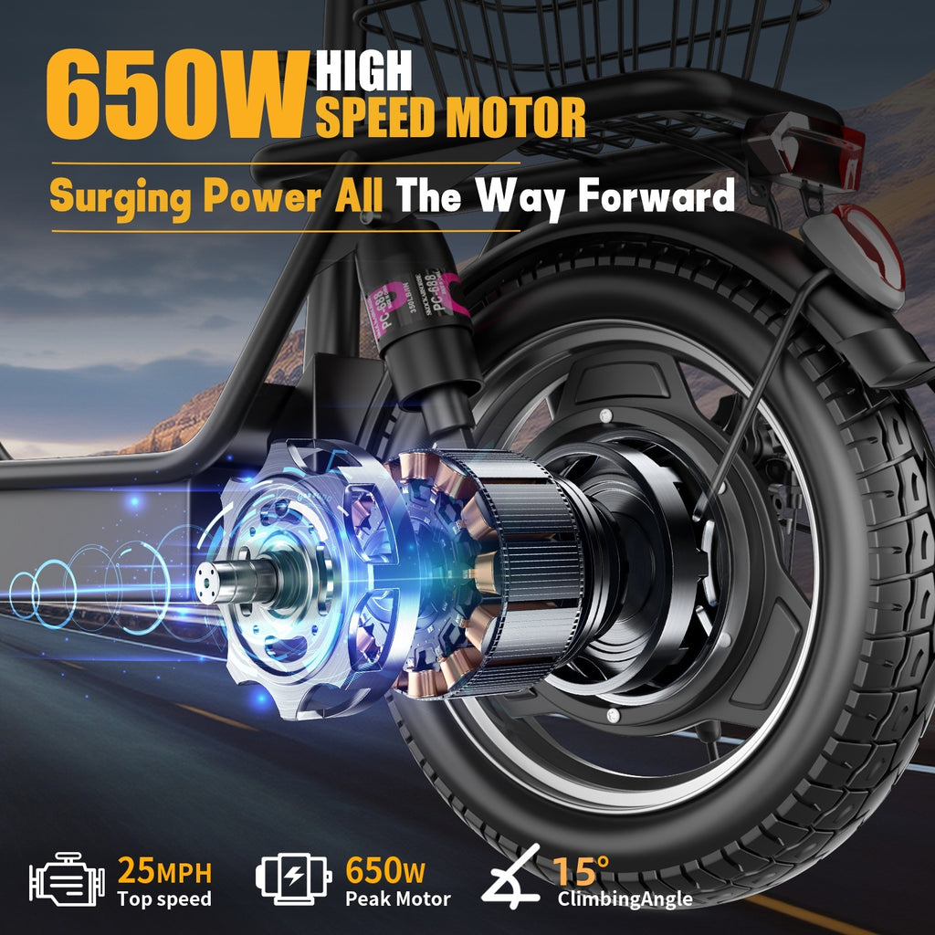 【Convenient Portable Design】- The electric scooter can be easily folded and stored with the basket in the trunk of your car, or taking public transportation. Its compact size and lightweight frame make it easy to transport, and it comes with a removable rear basket/rear box that can carry 39.6 lbs/18 kg for a total load capacity of 265 lbs.